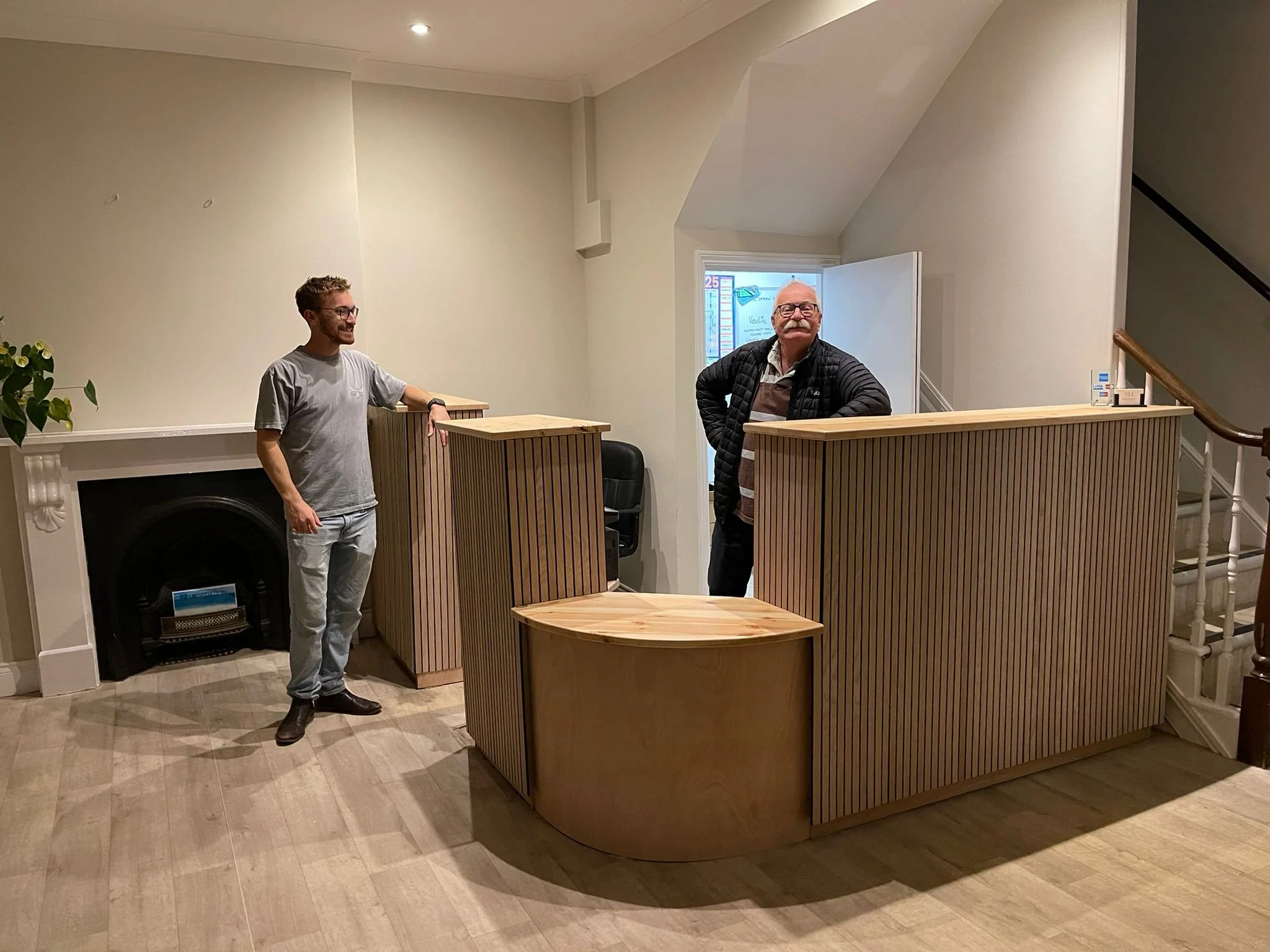 This wasn't an easy installation; it was a true labour of love! The entire desk was meticulously designed and built by our very own Dr. Siegfried Aylward. Reflecting the same precision he uses in dental care, Dr. Aylward constructed the robust frame using high-quality plywood before finishing it with a durable, elegant panelling. The result is a welcoming, professional focal point for our dental practice.